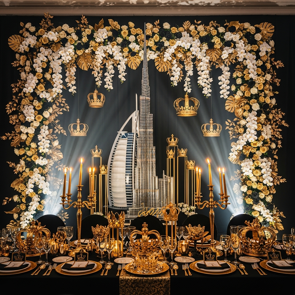 Royal themed decoration with Burj Khalifa prop and fresh flower frame.