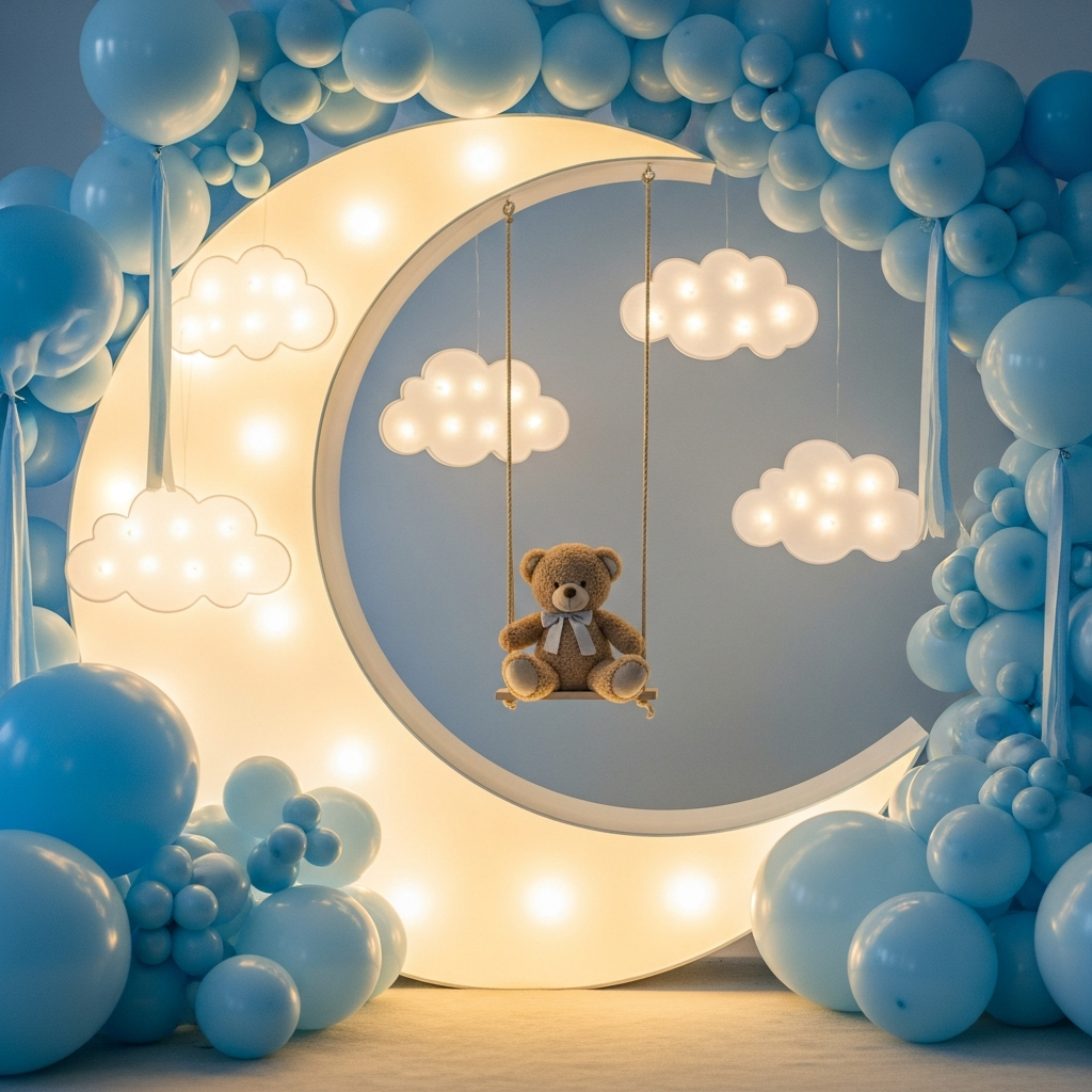 Dreamy moon-themed baby shower decoration with clouds, stars, and soft pastel balloons.